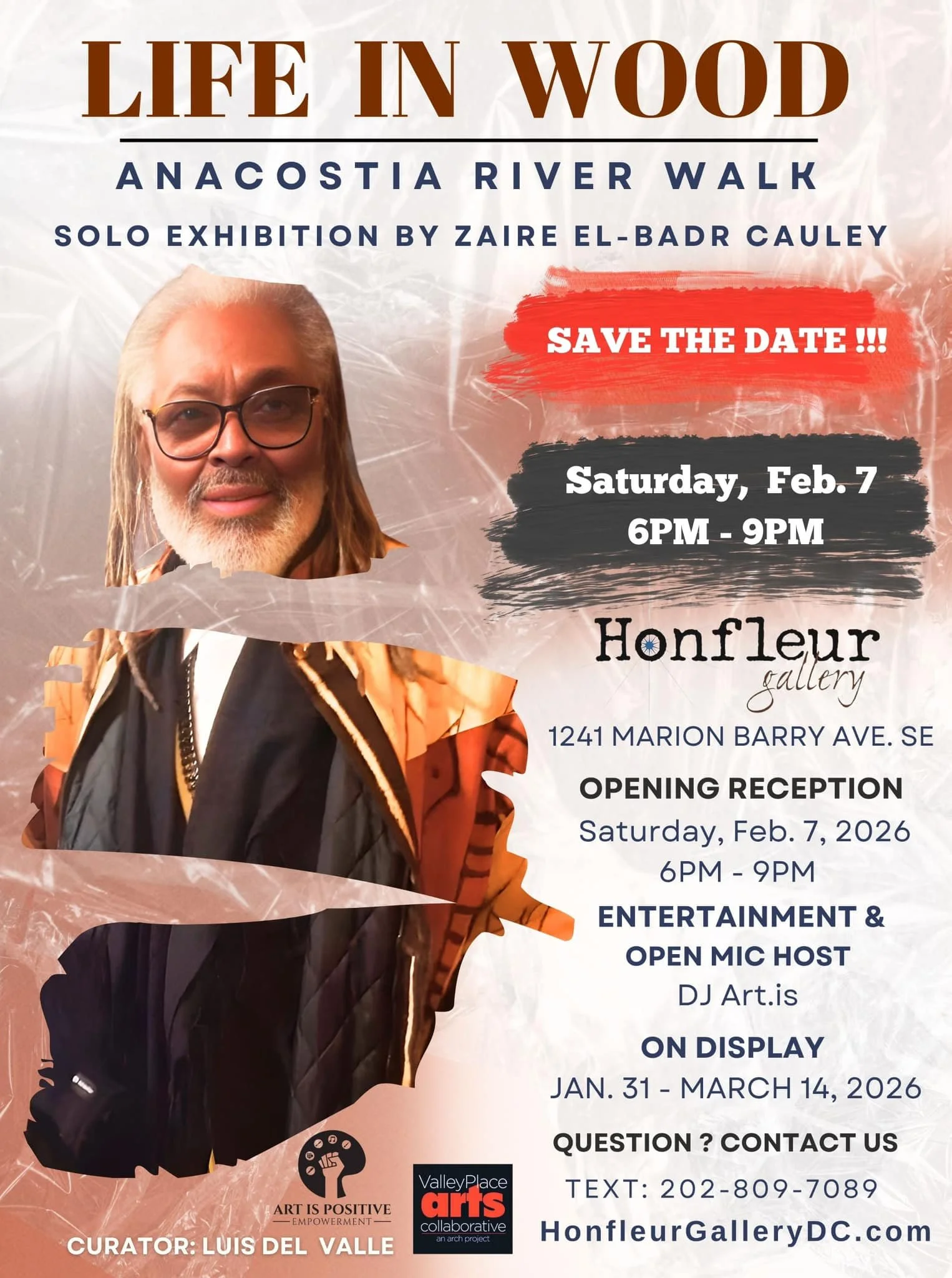 Life in Wood: Anacostia River Walk, curated by Luis Del Valle, opens with a special reception celebrating the life and six-decade artistic practice of Washington, DC cultural artist John Zaire El-Badr Cauley. The exhibition is presented by Valley Place Arts Collaborative in collaboration with Honfleur Gallery.