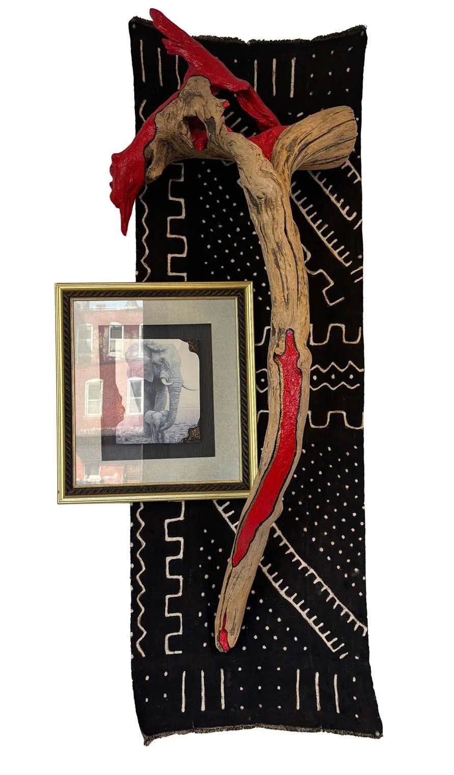 Working primarily with driftwood gathered from the Anacostia and Potomac Rivers, El-Badr transforms natural remnants into mixed-media assemblages that explore ancestry, migration, and endurance. Incorporating wood, gold leaf, found objects, and ancient gilding techniques, the work draws from African and Egyptian decorative traditions while remaining deeply rooted in local waterways and lived history.